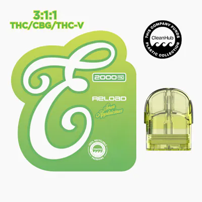 Our cutting-edge RELOAD pairs with our sleek, reusable battery delivering unparalleled flavor and sustainability. Crafted for the eco-conscious connoisseur, the RELOAD offers an eco-friendly solution to vaping. The FUSION Sour Appleicious 3:1:1 THC to CBG to THCV is a specially crafted ratio that combines the uplifting effects of THC with the focus-enhancing properties of THCV, providing a clear-headed and productive experience. Sour Appleicious is a mouth-puckering sensation of sour and sweet that delivers a burst of green apple goodness!