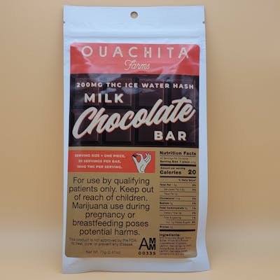 Ouachita Farms 200mg milk chocolate bar is made from the highest quality ice water bubble hash that you've come to expect from Ouachita Farms. Our hash is incorporated into high quality milk chocolate to create a product that combines the flavors of chocolate with the effects of cannabis when consumed. Each 200mg bar contains 20 servings of 10mg per serving.