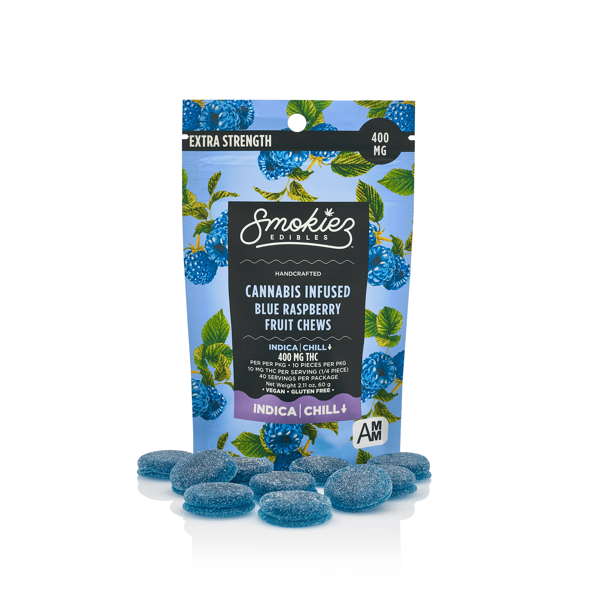 EXTRA-STRENGTH!Enhanced with real cannabis terpenes!Smokiez Blue Raspberry Indica Fruit Chews are NOT YOUR AVERAGE FRUIT CHEWS™ ;)These fruit chews taste like fresh raspberries, with a juicy and slightly tangy taste that is reminiscent of ripe berries. These delicious fruit chews are a tasty and discreet way for you to medicate!They are also Vegan, Gluten Free, Dairy-Free, and contain NO High Fructose Corn Syrup. Our mouth-watering fruit chews contain 40 mg of THC (4 servings per piece) and are made with our high-clarity cannabis distillate for great taste. There are 10 pieces per package with 400 mg of active THC per package.