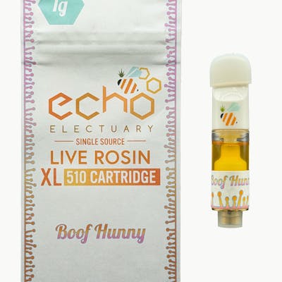 Boof Hunny (Hunny Bunny + Super Boof)* Expertly cultivated, fresh-frozen at harvest, washed, and pressed into a live rosin consistency for use in cartridges by Echo Electuary. Experience the quality control of single source extracts *the + indicates a flavor fusion as opposed to a single strain’s lineage % total terpenes