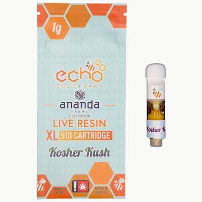 Kosher Kush (Unknown Legend) Expertly cultivated by Ananda Farms, fresh frozen at harvest, and processed into a live resin nectar consistency for use in cartridges by Echo Electuary. 11.3% total terpenes 4.7% Limonene 1.4% ß-Caryophyllene 1.3% ß-myrcene 0.8% Linalool 0.5% ß-Pinene