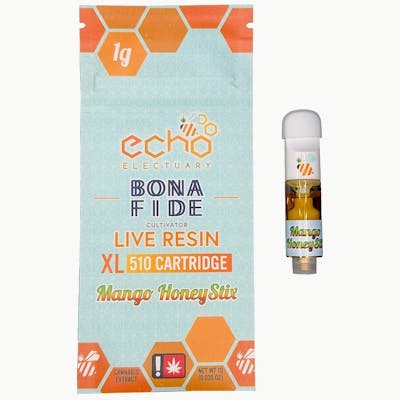 Mango HoneyStix (Honey Papaya x Wu Tang Pie) expertly cultivated by Bonafide Cannabis, fresh frozen at harvest, and processed into a live resin nectar consistency for use in cartridges by Echo Electuary. 12.1% total terpenes 3.7% ß-Caryophyllene 1.9% Limonene 1.3% ß-Myrcene 1.2% a-Humulene 0.9% Farnesene