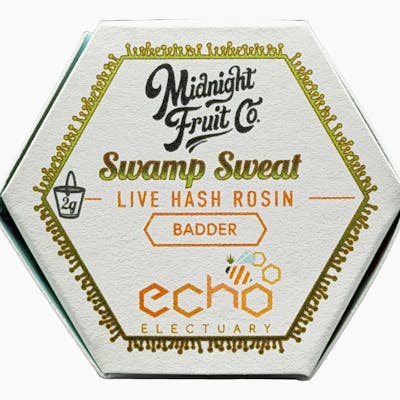 Swamp Sweat (Gasonade x Ogre Breath) expertly cultivated by Midnight Fruit Co., fresh-frozen at harvest, washed, and pressed into a live rosin budder by Echo Electuary. 8.31% total terpenes 2.5% limonene 1.4% ß-caryophyllene 1.1% ß-Myrcene 0.6% Linalool 0.5% ß-Pinene