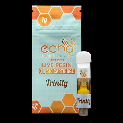 Trinity (Unknown Legend) cultivated, nitro-frozen at harvest, and processed into a live resin nectar consistency for use in cartridges by Echo Electuary Experience the quality control of single source extracts 10.4% total terpenes 5.3% ß-Myrcene 1.9% ß-Caryophyllene 0.7% a-Pinene 0.7% a-Humelene 0.5% Limonene