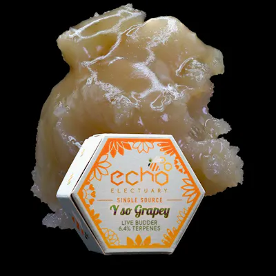 Y So Grapey (The Y x Grape Gas #51) cultivated, nitro-frozen at harvest, and processed into a live budder consistency by Echo Electuary. Experience the quality control of single source extracts 6.4% total terpenes 1.5% ß-Caryophyllene 1.5% Limonene 0.9% Linalool 0.8% ß-Myrcene 0.5% a-Humulene