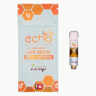 Zoap (Rainbow Sherbet x Pink Guava) cultivated, nitro-frozen at harvest, and processed into a live resin nectar consistency for use in cartridges by Echo Electuary Experience the quality control of single source extracts 12.3% total terpenes 3.9% Limonene 2.3% ß-Caryophyllene 1.6% Linalool 0.7% a-Humulene 0.6% Ocimene