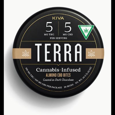 CBD Almond Terra boasts a rich, crunchy, sweet and salty taste you are sure to crave- with a balanced formula you’re guaranteed to adore. Each delectable dark chocolate bite is handcrafted with 5MG of THC and 5MG of CBD to bring you back to alignment in the most delicious way possible. Contains milk, soy and almonds. --------------------------------------------------------------------------------------------------------------------------- —- About The Brand —- In 2010, a young cannabis-loving couple set out on a mission to create a better edible experience for legal consumers. Scott Palmer and Kristi Palmer were inspired by a visit to a local chocolatier and soon started crafting the first Kiva Bars in their home kitchen. They didn’t realize it at the time, but they weren’t just creating a premium edible product, they were setting the gold standard for the entire legal cannabis industry. Since then, Kiva has brought their bars to 11 different markets, and rose to the top of them all. Kiva has had their success for a reason, their main priority is the health and safety of their customers, followed closely behind by how great of an experience their products will bring them! Cannabis consumers deserve to know exactly what they’re ingesting, which is why Kiva was one of the first edible makers in the country to self-impose stringent standards for potency, production, packaging and testing. Our commitment to the highest standards in ingredients remains unparalleled throughout our line of products. This includes using locally-grown cannabis, sustainably-sourced cacao, and all-natural flavors and ingredients for a range of artisanal products that are as effective as they are enjoyable. Kiva themselves currently only produce Chocolate Bars, but they run several other brands for other edible options. These include Camnino, for terpene based gummies, Lost Farm, for live resin based gummies, Petra, micro-dosed mints, and Terra, who produces an assortment of bite-sized snack edibles. No matter what you want to eat, Kiva has an option for you!