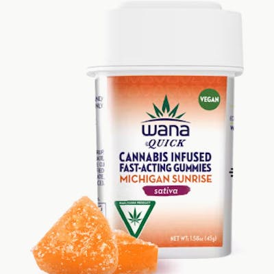 Michigan Sunrise 200 mg —- About The Product —- With a mountain-region riff on the flavors of a Tequila Sunrise, these uplifting terpene-enhanced gummies blend citrusy notes of orange with a pop of tart cherry. ----------------------------------------------------------------------------------------------------------------------- —- About The Brand —- Have you tried North America's Favorite Edibles Brand? With an innovative lineup of vegan, melt-proof, terpene-enhanced products, Wana Brands is committed to enhancing lives through the responsible use of cannabis. Wana's mission is to enhance people's lives by unlocking the full potential of the cannabis plant. That means using only the highest quality ingredients, investing in cutting-edge innovation, and giving back to all the communities we serve. Quality is crucial, but so is growth. Our Innovation team keeps us on the cutting edge of cannabis science, pouring thousands of hours every year into the research and development of first-of-their-kind products like our bestselling Wana Quick Fast-Acting Gummies. The result? An ever-growing lineup of product forms, doses, CBD/THC ratios, onset times, and effects that allow each of our consumers to customize their cannabis experience... while we keep working to unlock the full potential of the plant. Infused with a combination of over 30+ terpenes to create each effect, Wana edibles are some of the most effect-refined on the market! They are all vegan and gluten free and utilize a no-melt technology that allows you to take them wherever you go!