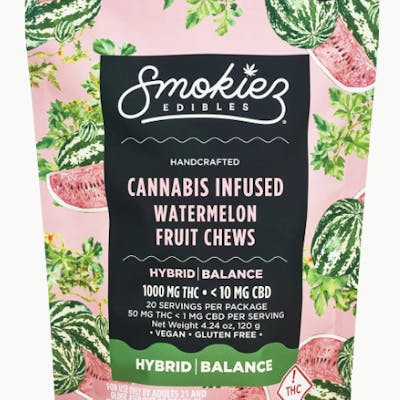 Smokiez Edibles Sour Watermelon Hybrid Fruit Chews Smokiez Fruit Chews are NOT YOUR AVERAGE GUMMIES™ These delicious Fruit Chews are a tasty and satisfying way for your customers to medicate! They are also Vegan, Gluten Free, Dairy-Free, and contain NO High Fructose Corn Syrup. Each of our mouth watering Fruit Chews contain 50 mg of THC, and made with our high clarity cannabis distillate for great taste. There are 20 pieces per package with 1000 mg active THC per package.