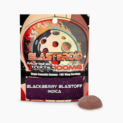 Blackberry Blastoff Blasteroid (by Monster Xtracts) is a highly potent indica-style gummy edible, containing 100 mg of THC in a single-dose format. It offers a deep, full-body relaxation paired with euphoric uplift—making it ideal for evening chill sessions, stress relief, or pain management. The bold, juicy blackberry flavor hides the potency well, but be sure to start low and go slow, especially if you're new to edibles.