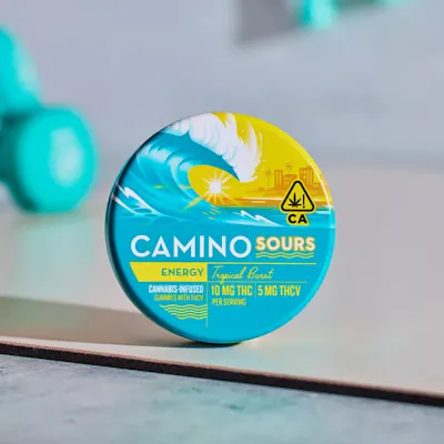 Kiva Camino Sours Tropical Burst Energy Gummies offer an exhilarating and vibrant experience with a unique blend of 10MG THC and 5MG THCV, plus vitamins B6, B12, and caffeine. Packed with sativa-like terpenes, these gummies are your perfect companion for a clear-headed, energized day.