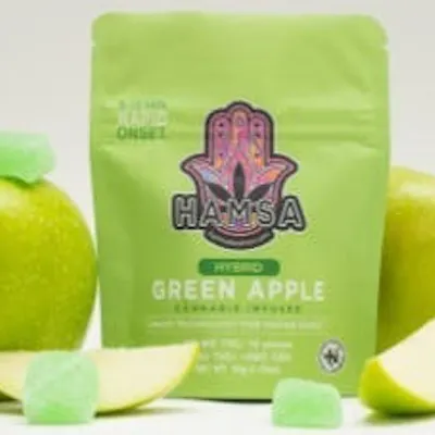 *VEGAN *KOSHER*FAST ACTING Sail through your day with the refreshing Hamsa Green Apple Hybrid Gummies. These mouthwatering delights of fast-acting THC relief will keep you calm and coasting through the chaos of your day.Hybrid – 10mg THC per piece. 10 perforated pieces per bag for simple micro dosing. Vegan – Kosher Certified – 5-10 Minute Rapid Onset – Gluten Free – Pectin Based