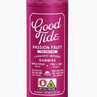 *VEGAN*GLUTEN FREETake your mellow to the next level with Good Tide Passion Fruit THC:CBD:CBN gummies.An Indica single-strain rosin is enhanced with an extra dose of CBN and CBD’s relaxing properties and the tropical delight of passion fruit flavor to help you sway into the perfect hammock nap.10mg THC:CBD:CBN per gummy, 100mg THC:CBD:CBN per container.