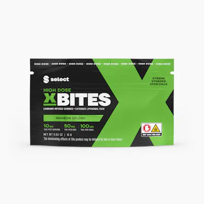 Bars are scored into five 10mg bites for easy dosing. High Dose X Bites are engineered with a proprietary liposomal coating that facilitates faster and fuller absorption of THC for longer-lasting effects. This is cannabis elevatedto the next level.Each pack comes with two scored 50mg THC bars, which offer 10mg THC Per Bite and 100mg Per Pack.