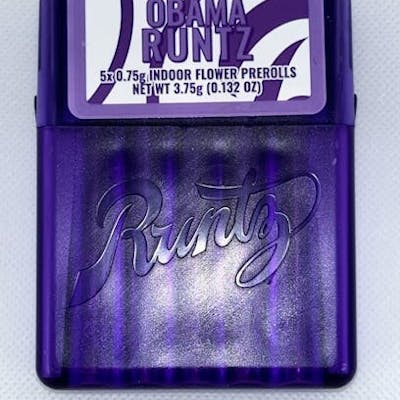 Runtz | Preroll Multipack | .75g 5pk | Obama Runtz | THC 25.4% | Indica-Hybrid Elevate your cannabis experience with the Runtz Preroll Multipack featuring the sought-after Obama Runtz strain. Each pack includes five expertly rolled .75g prerolls, delivering the perfect blend of convenience and quality for on-the-go enjoyment or a relaxing evening at home. Taste & Aroma: Dive into the rich, sweet flavor profile that Runtz is famous for. The Obama Runtz strain combines fruity and dessert-like notes, engaging your palate with hints of cream and berries that linger pleasantly. The aromas are equally inviting, offering a robust bouquet that will tantalize your senses and create an irresistible atmosphere. Potency: Boasting a potent THC level of 25.4%, these prerolls promise a robust and satisfying experience. Crafted for both seasoned cannabis connoisseurs and newcomers alike, the high is profoundly calming, setting the stage for relaxation and introspection. Effects: As an indica-hybrid, Obama Runtz merges the best of both worlds, providing a gentle uplift while promoting tranquility. Whether you’re unwinding after a long day or sharing laughter with friends, these prerolls will leave you feeling pleasantly euphoric and deeply relaxed. Expect sensations that envelop your body in a soothing embrace, easing tension and enhancing your mood. Quality & Craftsmanship: Each preroll is crafted with care by Runtz, a brand renowned for its quality. Made from premium-grade flowers, these prerolls ensure a consistent burn and optimal flavor throughout the session. The meticulous rolling process also guarantees that every puff delivers an unparalleled experience. Packaging: Stylish and discreet, the multipack is designed for easy storage and transport. Perfect for social gatherings, outdoor adventures, or personal use, it's the ideal companion for any occasion where you wish to indulge in a top-tier cannabis experience. Whether you’re a dedicated enthusiast or simply looking to try something new, the Runtz Preroll Multipack featuring Obama Runtz is an exceptional choice that brings together flavor, potency, and quality in one delightful package. Enjoy the sophisticated and joyful sensation that only Runtz can provide.
