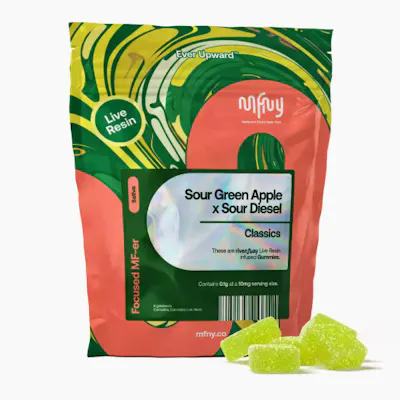 "The cultivar, the myth, the legend. It’s the first of the MFNY Classics that pay homage to the strains that shaped modern cannabis — and the highs they first brought us. MFNY Classics aren’t throwbacks, they’re living proof of what we can do by infusing old-school cultivars with modern processes. All to bring legendary, full-of-life flavors and effects to New Yorkers. Terpene-rich edibles at an even tastier price. Introducing our live resin Green Apple x Sour Diesel gummies. These vegan gummies are infused with MFNY’s single-source, in-house produced Sour Diesel live resin. We start with fresh-frozen flower buds, then use the hydrocarbon extraction method (plus years of experience and scientific precision) to deliver the purest plant extract. An extract that showcases the cultivar's naturally-produced, full-spectrum cannabinoids and remarkable natural terpenes. Sour Diesel is known for its deep diesel fuel and skunk with a sour cream backend. To complement the Sour Diesel cultivar, we add the minimum amount of sugar, plus green apple flavors."