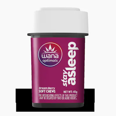 Dosage: 10mg THC & 20mg CBD & 5mg CBN & 5mg CBG per pieceStay AsleepPer Package: 200mg CBD, 50mg CBN, 50mg CBG, 100mg THCPer Piece: 20mg CBD, 5mg CBN, 5mg CBG, 10mg THCA higher potency alternative to Wana Optimals Fast Asleep Chews, these gentle bedtime edibles contain a custom blend of CBD, CBN, CBG, THC, and more than 30 specialized terpenes. They are most effective when taken an hour before bed.