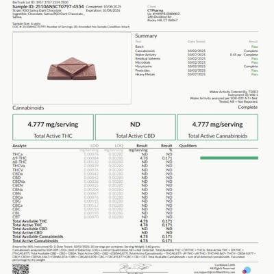4.78mg THC per triangle (half of square). 95.6mg THC total package. Cannabis chocolates are popular because the dominant chocolate flavor overpowers the "green" taste you may find in other edibles. Because edibles are digested and absorbed by your stomach and liver, the activation is often longer than other consumption methods, taking on average 45 minutes, and sometimes up to 2 hours. It is important to start low and slow when consuming edibles so you don't over do it. Take extra caution to ensure edibles are out of the reach of children.