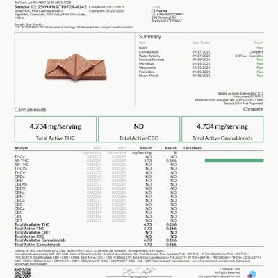 4.73mg THC per traingle (half of square) 94.6mg THC total. Cannabis chocolates are popular because the dominant chocolate flavor overpowers the "green" taste you may find in other edibles. Because edibles are digested and absorbed by your stomach and liver, the activation is often longer than other consumption methods, taking on average 45 minutes, and sometimes up to 2 hours. It is important to start low and slow when consuming edibles so you don't over do it. Take extra caution to ensure edibles are out of the reach of children.