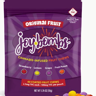 Savor a classic candy experience with Original Fruit Joy Bombs Candy-Coated Fruit Chews! Includes an explosive mix of delicious fruit flavors: Strawberry, Lemon, Grape & Fruit Punch! Joy Bombs’ signature sugary shell means they'll melt in your mind, but not in your car, purse, or pocket. They're perfect for easy snacking and sharing. Joy Bombs are purposefully dosed to help you dial in or stack the milligrams and effects that you want! With 2.5mg THC in each bite-sized piece, you can micro-dose for days or nom the whole pouch for a 100mg adventure! Dietary Info: Gluten Free & Vegan. Contains Soy.