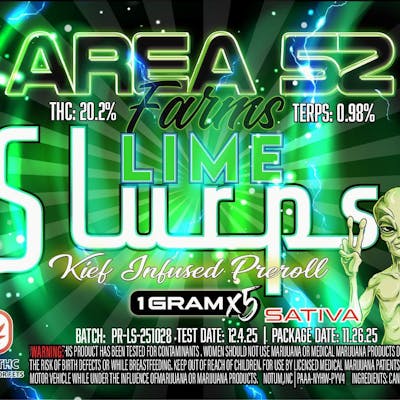 Area 52 | Lime Slurps | THC: 21.00% TERPS: 1.24% | 5 Pack kief Infused Pre-Rolls (Tax Included)