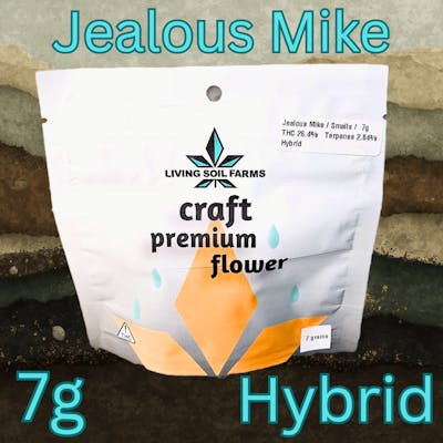 Living Soil 7g | Jealous Mike 50% Sativa 50% Indica THC: 26.4% CBD: 0.06% Total Terpenes: 2.837% Terpenes: Bisabolene 0.610%, b-Caryophyllene 0.575%, Limonene 0.329%, Farnesene 0.257% ... Jealous Mike is a hybrid strain that combines the best traits of Jealousy and Mike Larry V2. It is known for its creamy and sweet dessert-like flavor profile, accented by earthy kush, light diesel, and bright citrus. The high is fast-acting, offering a mentally clear high with euphoric thoughts and an uplifting mindset, accompanied by a deepening sense of bodily calm. ***** Effects: Creative, Euphoria, Happy, Motivation, Relaxing, Uplifting May Relieve: Depression, Fatigue, Nausea, Stress Flavors: Berry, Candy, Cherry, Creamy, Fruity, Sweet Aromas: Berry, Cherry, Citrus, Earthy, Sour, Vanilla
