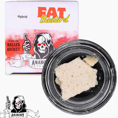 Anarchy | Fat Bastard | Baller Bucket Budder | 5g A hydrocarbon-refined concentrate made from dry and cured cannabis, whipped into a rich budder consistency that’s smooth, terpene-heavy, and easy to work with. Fat Bastard delivers a bold hybrid experience with strong flavor and balanced effects. Expect a rush of uplifting euphoria followed by a relaxing body buzz, making it great for staying elevated while still feeling calm and grounded. The large 5g baller bucket is perfect for frequent dabbers who want a flavorful, potent concentrate that can be enjoyed throughout the day or evening.