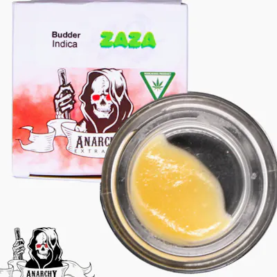 Anarchy | Zaza | Budder | 1g A hydrocarbon-refined concentrate made from dry and cured cannabis, whipped into a smooth budder consistency that’s easy to handle and packed with flavor. Zaza leans indica, offering a terpene-rich dab with bold aroma and a potent, relaxing effect profile. Expect a calming wave of euphoria followed by deep body relaxation, making it a great option for winding down, relieving stress, or settling in for a laid-back evening. The creamy texture makes it simple to scoop and perfect for clean, flavorful dabs.