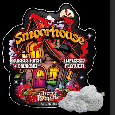 Smoorhouse | Cherry Poppinz | Infused Flower | 3.5g A bold, flavor-packed infused flower combining premium bud with bubble hash and diamond infusion for an elevated, heavy-hitting experience. Cherry Poppinz delivers sweet, fruity cherry notes with a smooth, slightly gassy finish. Expect a potent, well-rounded high that starts with an uplifting cerebral buzz before melting into a relaxing body effect—perfect for experienced consumers looking for next-level potency and flavor.