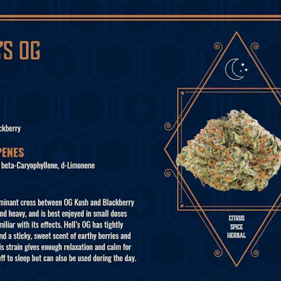Our products are grown and manufactured in a state-of-the-art facility. That means we can provide consistent results across the board, week after week. And with processes perfected by our team of experts, we produce only the cleanest, highest quality products. -------------------- Indica: Hell’s OG is fierce, bold, and delicious. This indica-dominant cross between OG Kush and Blackberry sets in quick and heavy, and is best enjoyed in small doses until you’re familiar with its effects. Hell’s OG has tightly packed buds and a sticky, sweet scent of earthy berries and sour citrus. This strain provides enough relaxation and calm for users to drift off to sleep but can also be used during the day. Elevate’s Hell’s OG has been grown in a way that promotes a powerful terpene profile: beta-Myrcene, Limonene, and alpha-Humulene lead the way. ---------------------- FLAVORS: Herbal, Citrus, Spicy LINEAGE: OG Kush x Blackberry TERPENES: beta-Myrcene, Limonene, alpha-Humulene