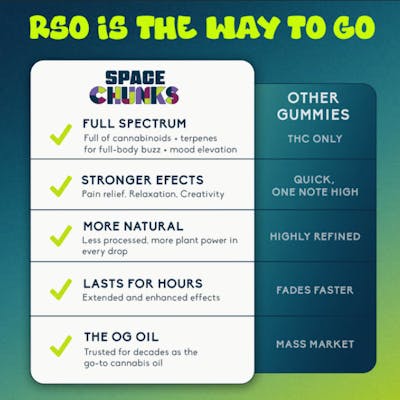 Launch your taste buds into orbit with Space Chunks—delicious gummies infused with 100mg of RSO cannabis oil extract. Each chunk delivers a cosmic crunch and the bold, full-spectrum effects of RSO, offering a unique and potent cannabis experience. With 2 (50mg) chunks per pack, Space Chunks make it easy to space travel one chunk at a time. Perfectly poppable and portable Space Chunks are designed for those who embrace the unconventional. Whether you're chasing adventure or winding down, these gummies deliver a mood enhancing, full body buzz and will take you on a ride that’s truly out of this world. Feel the full power of RSO the HIJNX way. With Space Chunks, the sky is not the limit—your cannabis, your way.