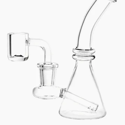 Mini Bent Neck Glass Beaker Dab Rig | 5" | 14mm F These on-the-go sized miniature oil rigs measure just 5 inches (12.7cm) tall and are made from quality borosilicate glass. With a clear beaker styles body and a fused downstem, these pipes are easy to use, ready to go, and simple to transport! Includes 14mm male quartz banger.