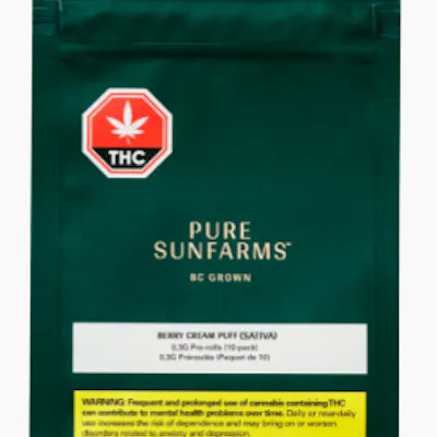 Berry Cream Puff is a BC grown cultivar from the Pure Sunfarms greenhouse. This powerhouse sativa is a Cake-Crasher cross. Boasting freshly baked notes of berry, gas and dairy from terpenes caryophyllene, limonene and linalool, its vibrant buds don flecks of purple hidden beneath a rich frosting of trichomes. Hand-harvested and hand groomed.