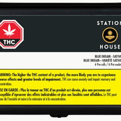 Classic Station House pre-rolls made from whole flower Blue Dream. A strong sativa that comes from crossing Blueberry x Haze. Blue Dream offers crisp, fresh and energizing aromas of berries, citrus and herbs. Machine rolled and packed just right for the perfect burn, every time. Precisely weighed and machine-rolled for an ideal, even burn. Packed with a humidity device to extend freshness. Conveniently packed, so you can always have some around. Quality cannabis, everyday fares.