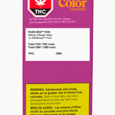 Color 1g Mango Haze PAX Pod is a CBD-dominant product and contains cannabis derived terpenes for a true representation of our well-known balanced cultivar. Mango Haze is sativa-dominant with a 2:1 CBD:THC balanced ratio, with dominant terpenes beta-myrcene, farnesene, beta-caryophyllene and linalool that combines to create a rich mango flavour profile with a hint of spice. Our PAX Pods contain extract made with 100% cannabis. PAX Pods are dependable, leak-resistant and designed to be clog-free. Color PAX Pods are designed exclusively for use with the PAX Era and PAX Era Pro devices, sold separately.