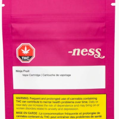 Ninja Fruit indica-dominant hybrid distillate from -ness is 510 compatible with 1g fill and very strong THC potency potential. Produced in BC with local whole flower from the Fraser Valley, it has sweet grape and tropical fruit flavour from a terpene profile of caryophyllene, limonene and myrcene. -ness distillate is pulled through an advanced ethanol extraction process and does not contain added solvents, pigments, fillers or waxes. The cartridges feature No Burn Technology™ for exceptional terpene flavour retention and a proprietary ceramic core that smoothly absorbs oil for consistent vaporization and even heating. Don’t let Ninja Fruit sneak past. Explore your -ness.