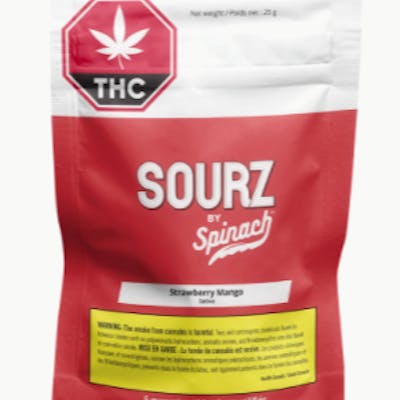 What happens when you mix luscious strawberry and tropical mango flavours? You get a thundering burst of flavour with Strawberry Mango SOURZ by Spinach™. This dual-flavored soft chew blasted with sour crystals is over-the-top with only natural flavours and colours. With 5 big “S” gummies per pack, you and your friends can enjoy more SOURZ by Spinach™ in one sitting. 10 mg THC total per pack.