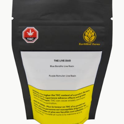 Earthwolf Farms selected two of their finest live rosin and united them into a single jar to offer diversity to the people seeking to discover new things. This rosin duo offers two different strains with different terpene profile to double the experience that our products has to offer. Sour Green Mango| 59.07% & 0.26 Blue Bandita|58.03% & 0.25%