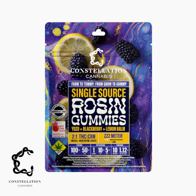 Our Yuzu, Blackberry, and Lemon gummies bursts with a bright, tangy trio of flavors made from real ingredients you can actually pronounce. Created by the family-owned and operated team at Constellation Cannabis, this treat pairs our signature, award winning single-source hash rosin with a smooth 2:1 THC to CBN ratio. These gummies rank low on our ZZZ Meter, meaning they will help you unwind without making you sleepy. Expect a gentle, easygoing calm rather than a knockout. Each gummy is formulated with our vegan, gluten-free recipe that stays clean, vibrant, and delightfully dependable.