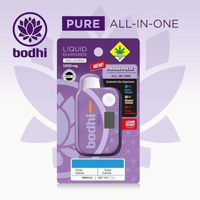 Meet the Prana Pulse — Bodhi’s next-gen All-In-One. Our state-of-the-art hardware features Full Spectrum, Liquid Diamonds made from 100% Live Resin—crafted to elevate the moment. -Award Winning -Liquid Diamonds -100% Live Resin -Full Spectrum Prana Pulse All-In-One Powered by Terpene Preservation Technology (TPT), where cutting-edge hardware meets premium oil. Cotton Free: No more cotton means no more wasted oil and a cleaner taste. Quartz Crystal Atomizer: Enjoy the cleanest flavor down to your final puff! Heat Wave Vapor Production: Exceptional flavor, no burnt taste. Longer-lasting battery. The all-new Smart Control Button puts precision in your hands. Preheat with cold start and countdown. Track your session with dosing feedback. Switch between Pure Flavor, Bigger Clouds, or Peak Intensity—all with a few quick taps. Designed for control and crafted for performance, Prana Pulse fine-tunes every moment to match your flow. Our TPT heat wave vapor production system provides extended oil use, maximum flavor and bigger clouds.