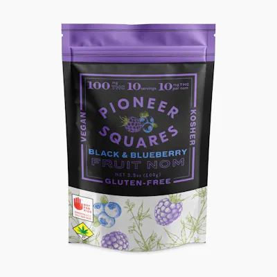 PIONEER SQUARES Black & Blueberry THC gummies are gluten-free, vegan and Kosher. We start with a tart blackberry base and add a sweet candied blueberry. These small batch artisan fruit chews are a beloved favorite among Washington locals! 100mgTHC per bag, 10mgTHC per gummy. Ingredients: Light Corn Syrup, Sugar, Water, Fruit Pectin, Blueberries, Baking Soda, Cannabis Extract, Blackberry Flavor (Natural Flavors, Sunflower Oil), Canola Oil, Citric Acid, Agar Agar