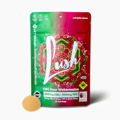 Gummies Lush Sour Watermelon 1:1 (DOHC) Edibles - 10pk 100mg CBG | 100mg THC