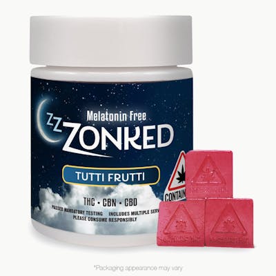 Sleep like a log tonight with Zzzonked Edibles, the all-new super sedating collection of gummies. Made with a natural blend of melatonin and full-spectrum cannabinoids: CBN, CBD, and THC, it's the perfect recipe for a good night's sleep. Zzzonked can help you fall asleep faster, deeper and regulate your sleep cycle for a more replenishing rest. Eat one piece an hour before going to bed, and relax. Onset effects may take up to one hour to begin; effects may include calmness, drowsiness, and sedation. Allergens: Contains Tree Nuts Ingredients: Corn Syrup, Sucrose, Water, Gelatin, Dextrose, Sorbitol, Citric Acid, Tutti Frutti Flavoring, Cannabis Extract Oil, MCT Oil, Purple Food Coloring, Potassium Sorbate, Melatonin, CBD Isolate, CBN Isolate