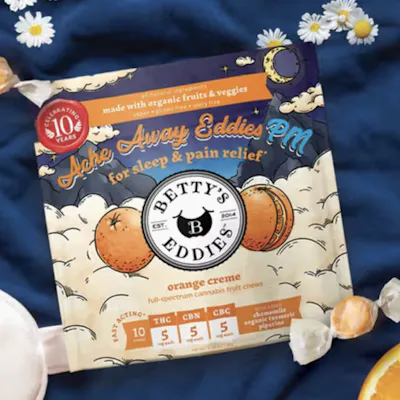 Unwrap, unwind, and “ahhhhhhh”. Did you know sleep is an essential part of physical recovery? A good night's rest is key to feeling our Betty best self! We've combined our two best-selling fruit chews - Bedtime Betty's and Ache Away Eddies - into one dreamy formula to encourage a night of soothing slumber. Meet Ache Away Eddies PM, our newest recipe infusing full-spectrum cannabis, CBN, CBC, Chamomile, Turmeric and Piperine into an Orange Creme fruit chew, so you can doze off to dreamland and wake up tomorrow ready to seize the day. Betty knows best, invest in good rest!