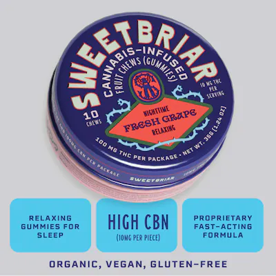 CBG: 0.05mg/g | CBN: 3.26mg/g | THC: 107.35mg/g | THC9: 3.07mg/g -- Unwind the right way with SWEETBRIAR Nighttime Fresh Grape chews — a smooth, juicy grape flavor crafted for evening relaxation and restful vibes. Designed for after-hours use, these fast-acting gummies help ease the mind and body so you can settle in and recharge. Each container includes 100mg THC and 100mg CBN, evenly dosed at 10mg THC + 10mg CBN per piece. This balanced 1:1 blend pairs THC’s calming effects with CBN’s reputation for promoting relaxation, making it a great option for customers looking to wind down at the end of the day.