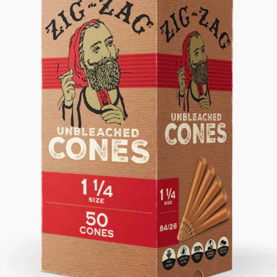 Zig-Zag Unbleached Cones are ultra thin crafted using a blend of natural fibers without the addition of any ingredients or processing. Recycled cardstock booklet with vegetable ink printing. All Zig-Zag papers have a thin glue line to provide a perfect seal – every time. Derived from the sap of the African acacia tree, the natural properties of 100% raw natural gum Arabic glue line provide a consistent seal without impacting the taste of your smoke. Substrate: Made from Unbleached Natural Flax Plant Fibers Paper Size: 1 1/4 (78mm) Thickness: Ultra Thin Capacity: ~0.5g Pack Size: 50 cones/box