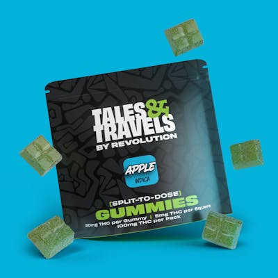 CBD: 0.06mg/g | THC9: 3.1mg/g -- Apple Indica Split-To-Dose Gummies deliver a delightful dose of chill to get you feeling sweet as pie. How do ya like them apples? 🍏 Pairs Well With: Lava Lamps, Crisp Soda, Couch Surfing Choose your own adventure: split it, share it, stash it, or smash it - the dose is up to you! Split-To-Dose Gummies are scored into four equal squares, [1 Square = 5mg THC, 1 Gummy = 20mg THC] making them a great go-to for any gummy geek. 😋 Available in 100mg 5-Packs [100mg THC per Pack | 20mg THC per Gummy | 5mg THC per Gummy Piece]. Made with pectin. No artificial flavors or dyes. Tales & Travels is the spunky little sibling of the award-winning Revolution Cannabis. We're affordable, full of character(s), and know how to blend our big sister's expertise into a fun mix of THC goodies - perfect for everyone from the canna-curious to the canna-chronic. WEED got something for everyone. revcanna.com
