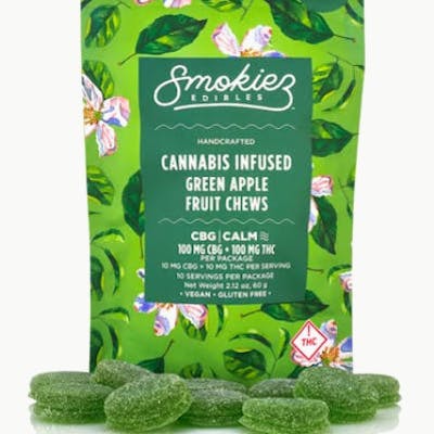 CBG | CALM Smokiez Sweet Green Apple CBG:THC 1:1 Fruit Chews are NOT YOUR AVERAGE FRUIT CHEWS™ ;) These delicious fruit chews are a tasty and discreet way for you to medicate! They are also Vegan, Gluten Free, Dairy-Free, and contain NO High Fructose Corn Syrup. Each of our mouth watering fruit chews contain 10 mg of CBG and 10 mg of THC, and made with our high clarity cannabis distillate for great taste. There is 10 pieces per package with 100mg CBG + 100 mg active THC per package. -- SO... WHAT IS CBG? Known as the mother of all cannabinoids, CBG has many potential benefits, including antibacterial, antimicrobial, & anti-inflammatory qualities.