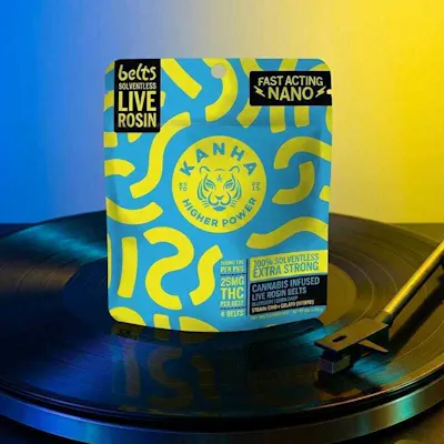 KANHA NANO Hybrid Blueberry Lemon Drop Solventless Rosin Belts 25mg THC per belt/100mg THC per package Feel the perfect balance with our Blueberry Lemon Drop Belts, a vibrant Hybrid mix designed for the harmony hunters. Formulated with solventless rosin for a comforting, mood-boosting journey. Solventless Rosin Strain-Specific Fast-Acting NANO Hits Like Flower Instructions: Eat 1 serving. Onset starts around 5-15 minutes. Wait 60 minutes for full effect. Keep in a cool, dry place. Avoid temperatures over 75°F. Ingredients: Tapioca Syrup, Cane Sugar, Water, Gelatin, Agar, Locust Bean Gum, Citric Acid, Lactic Acid, Natural Flavor, Natural Fruit Concentrate, Natural Color, Carnauba Wax, Solventless Live Rosin Cannabis Oil, Malic Acid, VESIsorb Nanotechnology Servings: 20, Serving Size (2.5g), Amount per serving: Calories 7, Total Fat 0g, Sodium 0mg, Total Carb. 2g, Total Sugars 2g (incl. 2g Added Sugars)