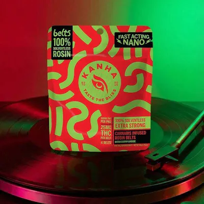 KANHA NANO Sativa Cherry Limeade Solventless Live Rosin Belts 25mg THC per belt/100mg THC per package Zing into action with our Cherry Limeade Belts, a punchy Sativa blend crafted for the thrill-seekers. Made with solventless rosin for a zesty, cerebral effect. Solventless Rosin Strain-Specific Fast-Acting NANO Hits Like Flower Instructions: Eat 1 serving. Onset starts around 5-15 minutes. Wait 60 minutes for full effect. Keep in a cool, dry place. Avoid temperatures over 75°F. Ingredients: Tapioca Syrup, Cane Sugar, Water, Gelatin, Agar, Locust Bean Gum, Citric Acid, Lactic Acid, Natural Flavor, Natural Fruit Concentrate, Natural Color, Carnauba Wax, Solventless Live Rosin Cannabis Oil, Malic Acid, VESIsorb Nanotechnology Servings: 20, Serving Size (2.5g), Amount per serving: Calories 7, Total Fat 0g, Sodium 0mg, Total Carb. 2g, Total Sugars 2g (incl. 2g Added Sugars)